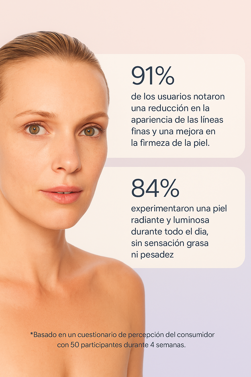 Estimula la producción de colágeno, mejorando la elasticidad y reduciendo la apariencia de líneas finas y arrugas.